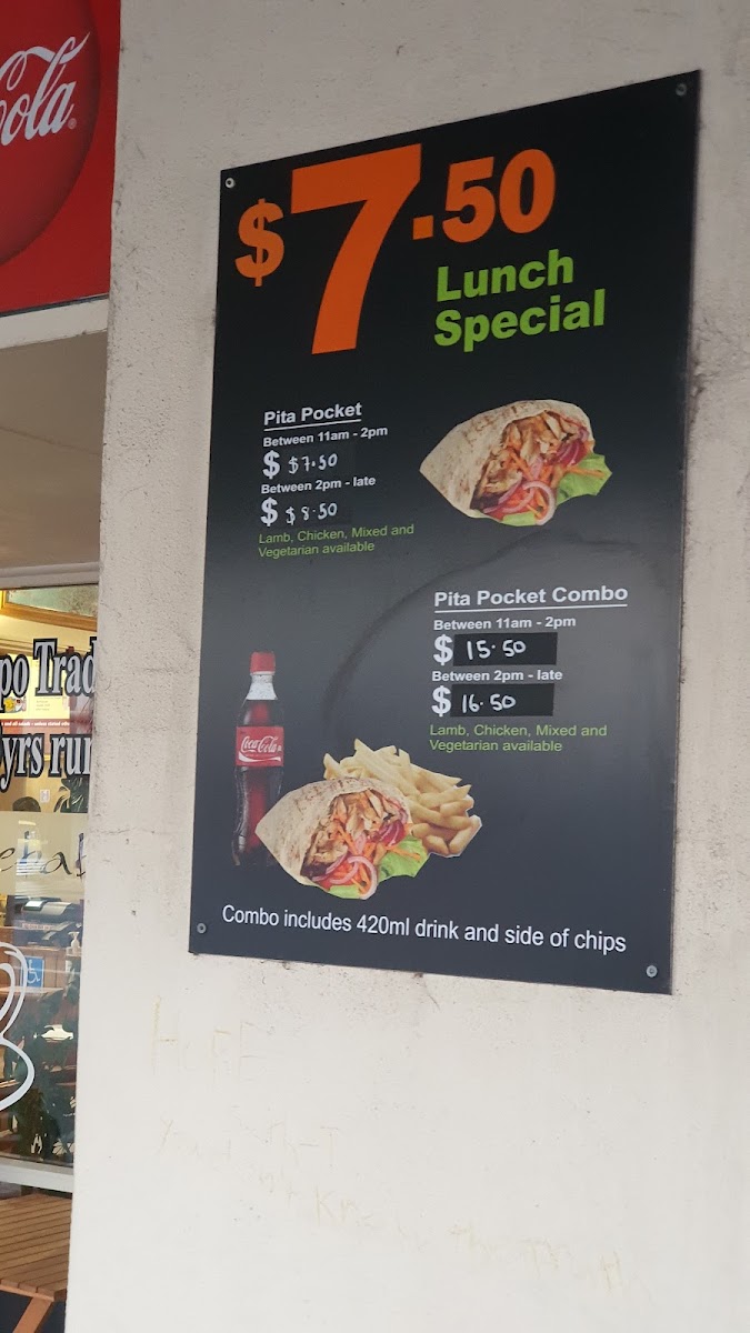Chips sprinkled with doner meat or falafel, cheese, chopped onion, capsicum and spring onion with your choice of sauce.